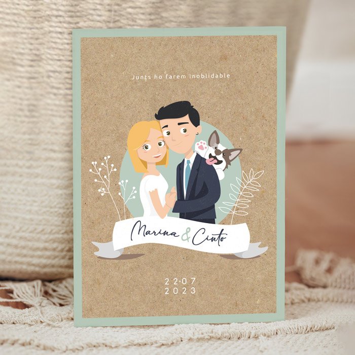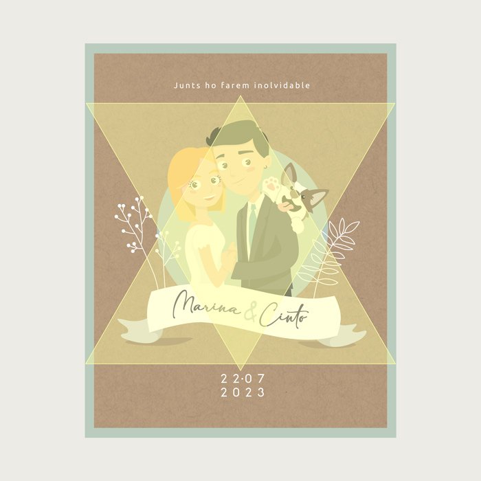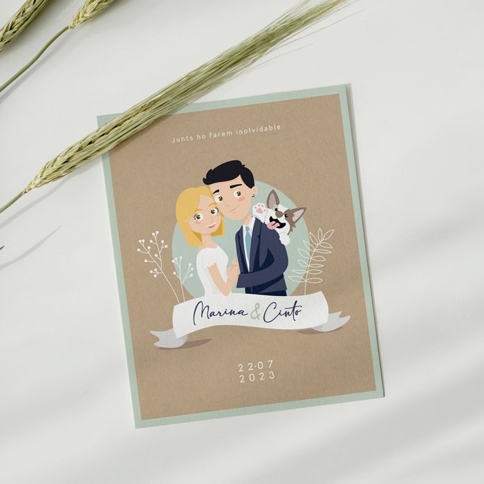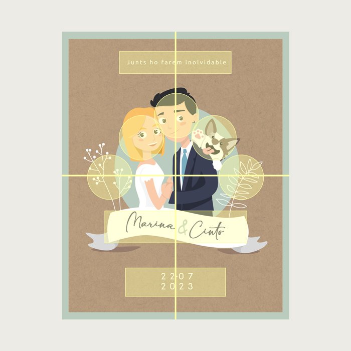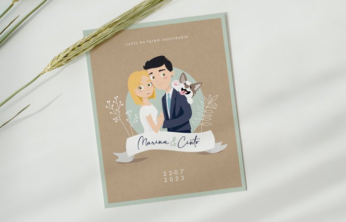 El encargo fue realizar una ilustración de los novios con un carácter divertido pero sobrio. Además, en el brief había un elemento muy bonito: la ilustración de su perrito.