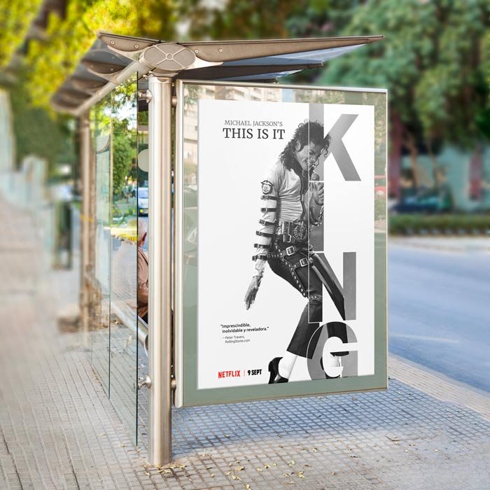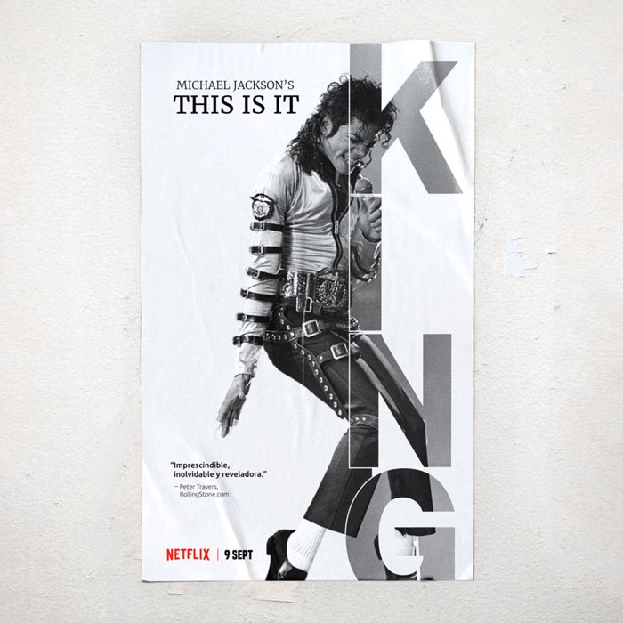 El resto de los elementos del cartel están dispuestos estratégicamente para mantener el enfoque en la figura central de Michael Jackson. El título de la película, en letras grandes y claras, se sitúa en la parte superior, asegurando que no pase desapercibido. La crítica llamativa realizada por un crítico profesional añade credibilidad y genera interés adicional en el proyecto.