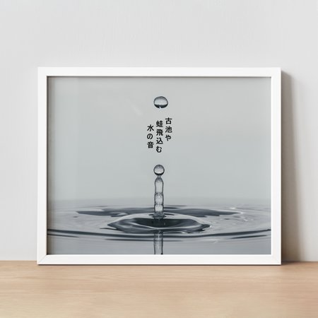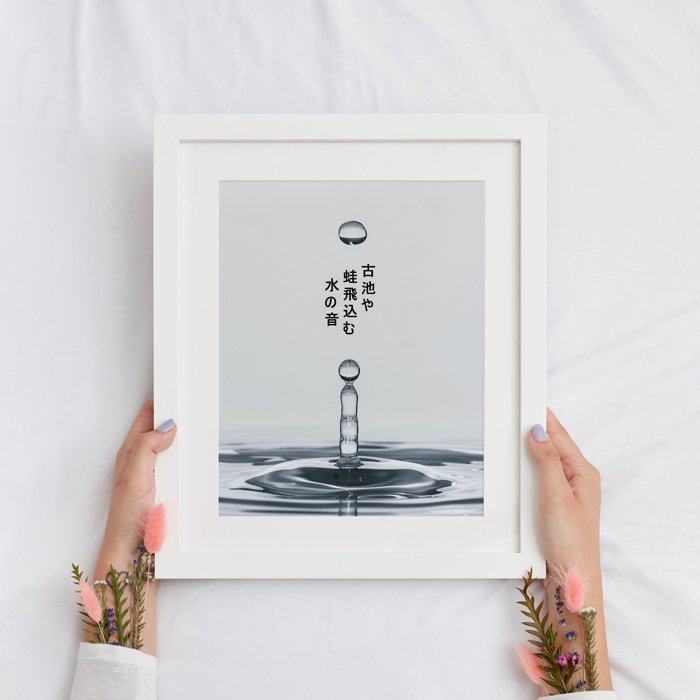 El equilibrio tonal se logra mediante una paleta de colores suaves y naturales, transmitiendo la serenidad del paisaje acuático. Los elementos están dispuestos de manera simétrica y equilibrada, creando una sensación de armonía visual que refleje la armonía poética del Haiku.